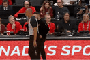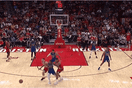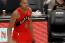 NBA常规赛,猛龙主场迎战雄鹿的比赛正在进行中。比赛的第三节,巴恩斯迎着字母哥投进三分,做出“就这”的手势。